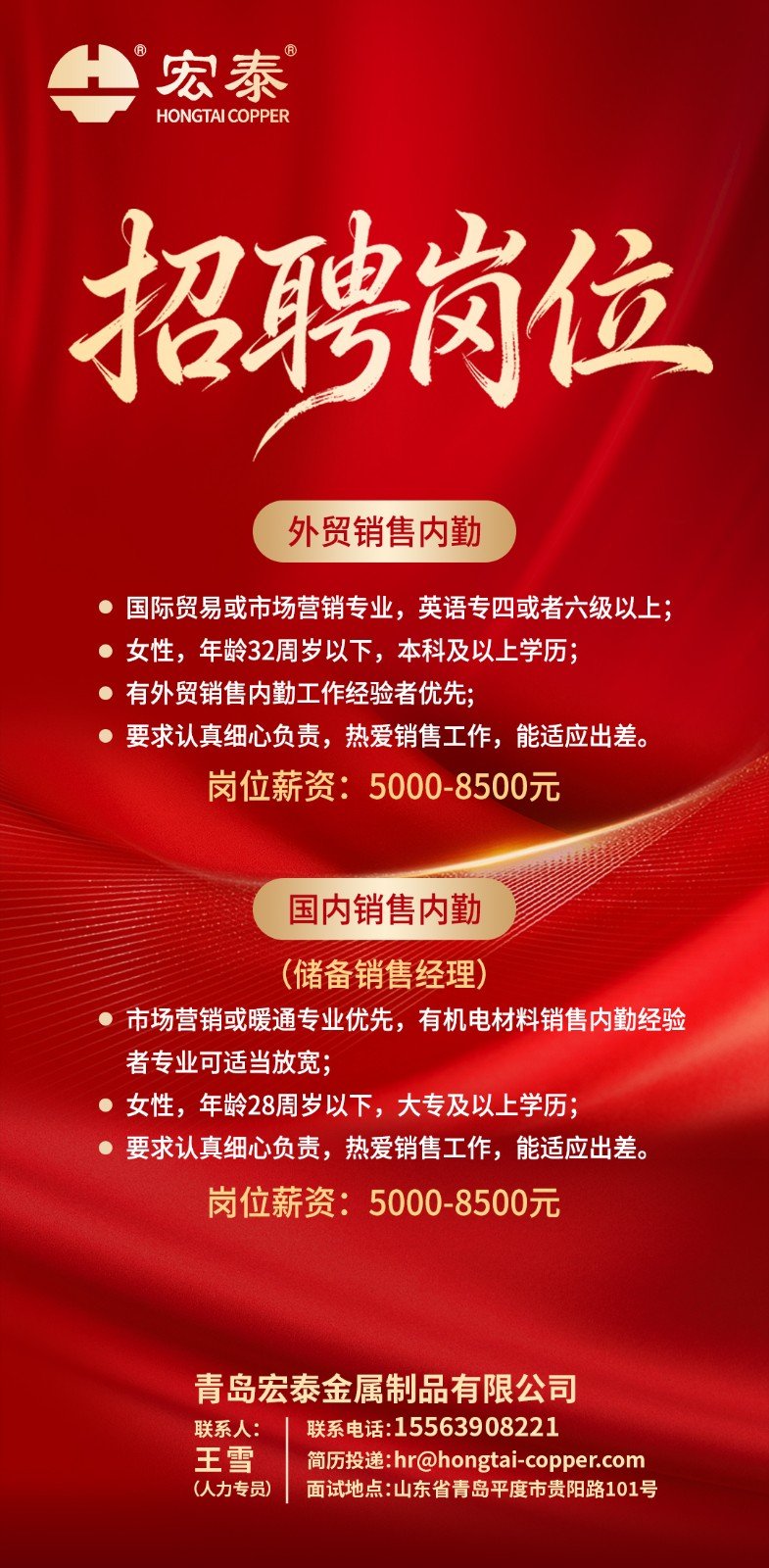 宏泰自1993年開始一直專注于紫銅管系列產品的研發與生產,宏泰商標也榮獲“中國馳名商標”的殊榮,企業年銷售達三十多億元,展現出強勁的發展實力。作為平度本土企業,宏泰在三十多年的發展歷程中,積淀了深厚的企業文化底蘊。公司新建“智能化綠色制造高精度紫銅管生產線”,為滿足發展需求,補充優秀賢能人士,需要招聘以下崗位。